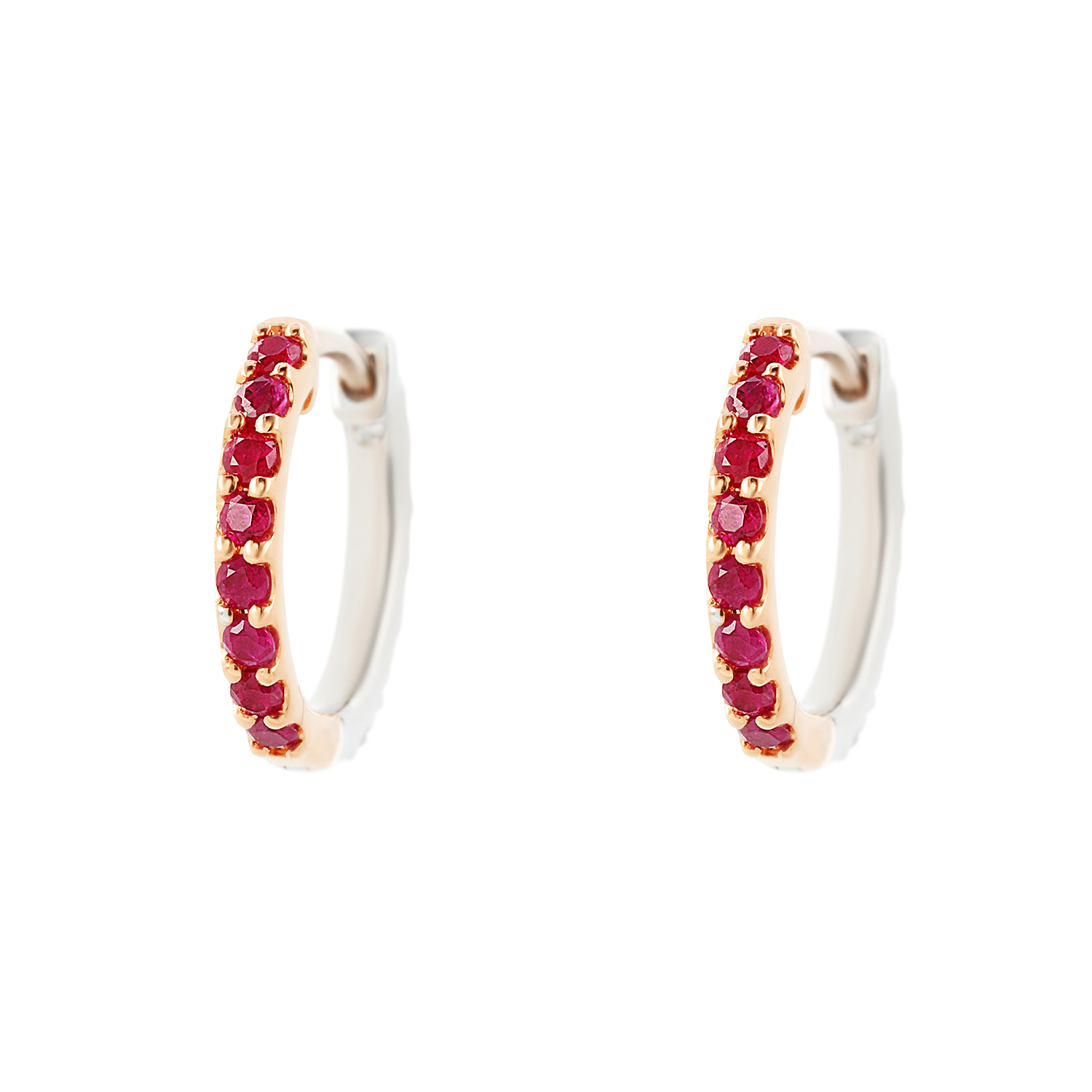 Unique double-sided earrings that combine two luxurious looks in one elegant design. One side of the earrings is crafted from white gold and adorned with 16 brilliant diamonds with a total weight of 0.253 ct, offering a classic and timeless sparkle. The other side is made of rose gold and set with 16 deep red rubies totaling 0.293 ct, adding warmth and rich color to the piece. The reversible design allows the earrings to be worn according to mood or outfit — the diamond side is perfect for special occasions, while the ruby side highlights individuality and a bold sense of style. The refined hoop shape and comfortable clasp make these earrings an ideal choice for both everyday wear and special events.