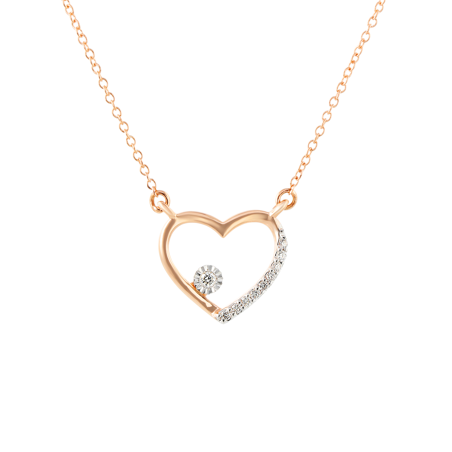 Elegantne ja romantiline punasest kullast kaelakee südamekujulise ripatsiga, mida kaunistavad säravad teemandid. Ripatsis on kokku 10 teemanti kogukaaluga 0,046 karaati: 1 teemant kaaluga 0,012 ct, 2 teemanti kokku 0,008 ct ja 7 teemanti kokku 0,026 ct. Teemantide kvaliteet H/SI tagab kauni sära ja puhtuse. Kaelakee pikkus on reguleeritav vahemikus 42–45 cm, võimaldades mugavat ja mitmekülgset kandmist. Õrn ja ajatu ehe, mis sobib ideaalselt nii igapäevaseks kandmiseks kui ka südamlikuks kingituseks.
