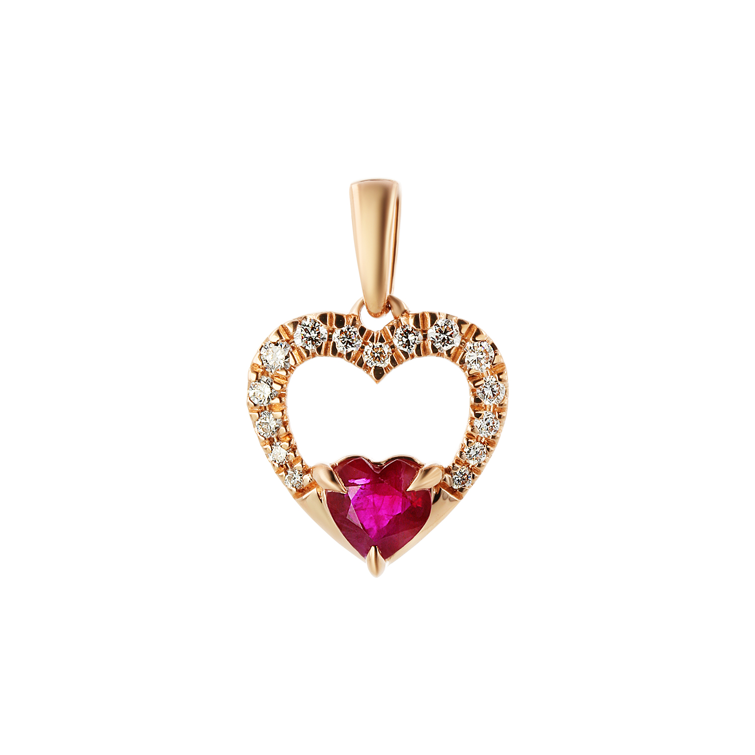 Элегантная и выразительная подвеска из красного золота с сердечным дизайном и насыщенно-красным рубином в центре. Украшение дополнено 15 бриллиантами общим весом 0,095 карата: 3 бриллианта — 0,015 ct, 4 бриллианта — 0,016 ct, 4 бриллианта — 0,024 ct и 4 бриллианта — 0,04 ct, качества H/SI, обеспечивающих красивое сияние и чистоту. В центре композиции расположен 1 рубин весом 0,35 карата, придающий украшению глубину и роскошный акцент. Изысканная и романтичная подвеска для особых случаев и повседневной элегантности.