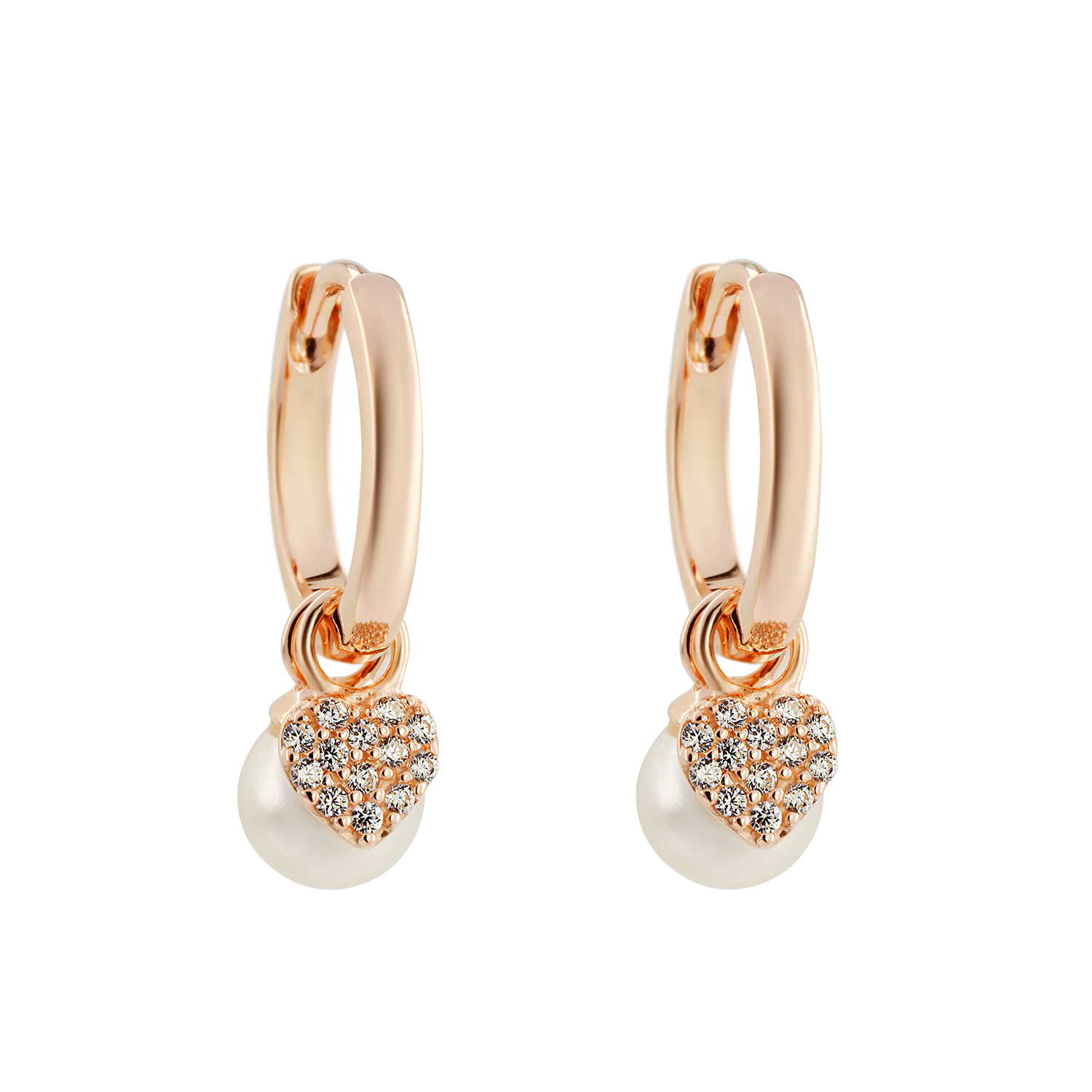 Elegant gold-plated earrings set featuring a sparkling pearl and a heart-shaped charm with stones, giving a refined and romantic look.