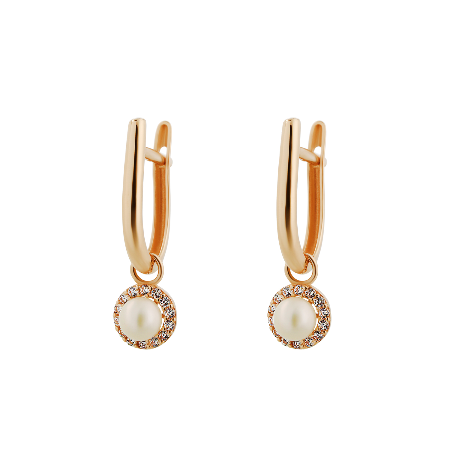 Elegant gold earrings featuring a delicate pearl drop surrounded by sparkling cubic zirconia. The timeless design combined with a modern shine creates a piece that highlights femininity and refined beauty. Lightweight and versatile, these earrings are perfect for both everyday wear and special occasions.