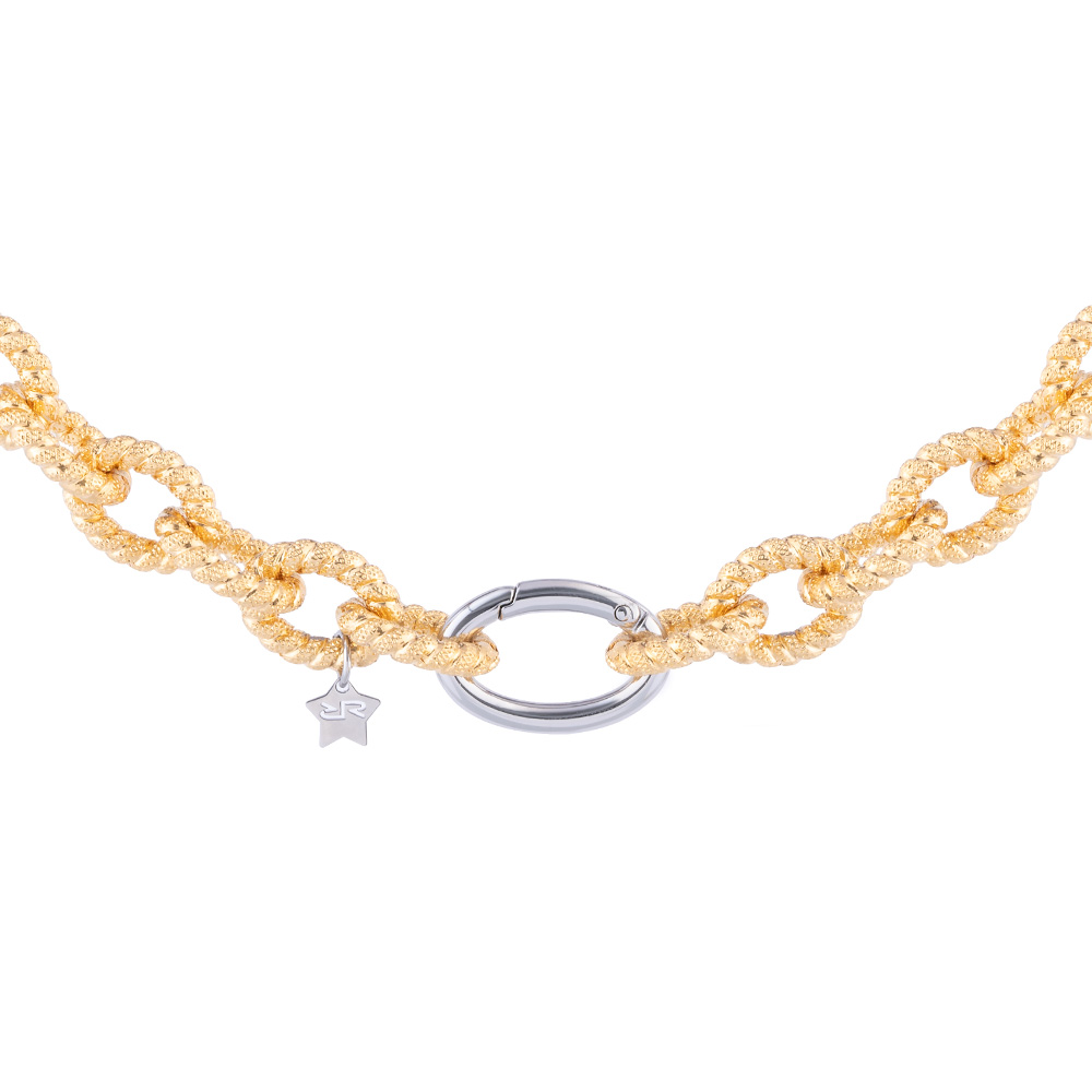 A stunning Rebecca necklace crafted from richly textured gold-tone links, creating a soft, voluminous, and luxurious look. The twisted links bring a modern, trendy vibe, while the contrasting polished silver ring highlights the contemporary design. A small star charm adds a playful and personal touch. A perfect accessory to elevate both everyday outfits and elegant evening styles.