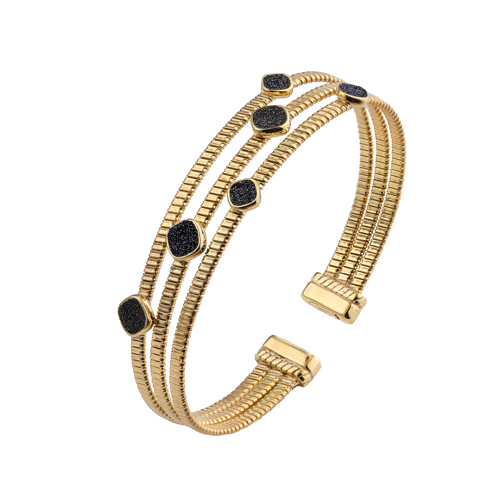 A striking and modern open bracelet by Rebecca featuring a refined triple-row gold-tone design. The bracelet is embellished with genuine black diamonds, adding depth, contrast, and luxurious sparkle. The open structure ensures comfortable and effortless wear.
