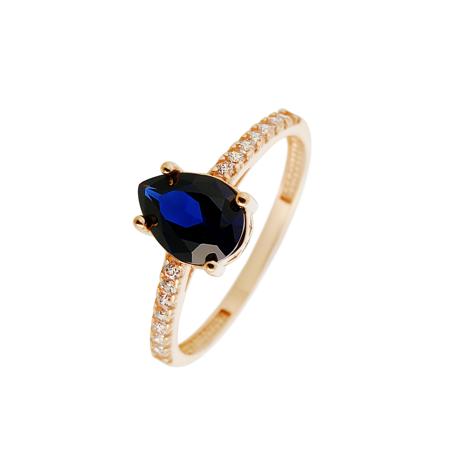 Gold ring with a large blue teardrop stone and a zircon-accented band. Elegant and striking.