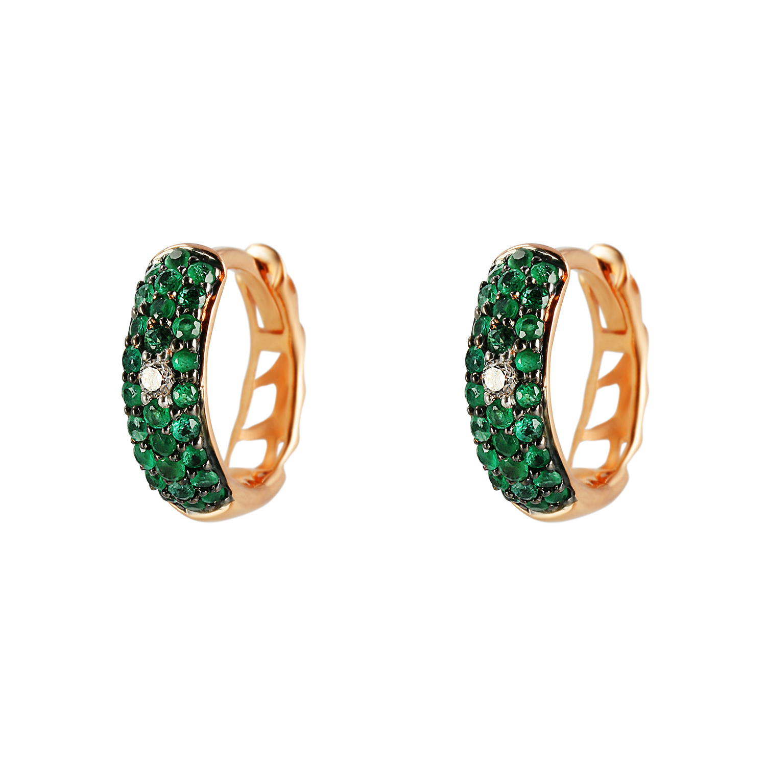 Элегантные серьги из красного золота, украшенные бриллиантами и изумрудами. Серьги инкрустированы 2 бриллиантами общим весом 0,028 карата (цвет H, чистота SI). Изумруды представлены в нескольких размерах: 4 камня общим весом 0,016 карата, 18 камней — 0,144 карата и 32 камня — 0,192 карата. Общий вес вставок составляет 0,352 карата. Изысканный дизайн делает эти серьги подходящими как для повседневной носки, так и для торжественных случаев.