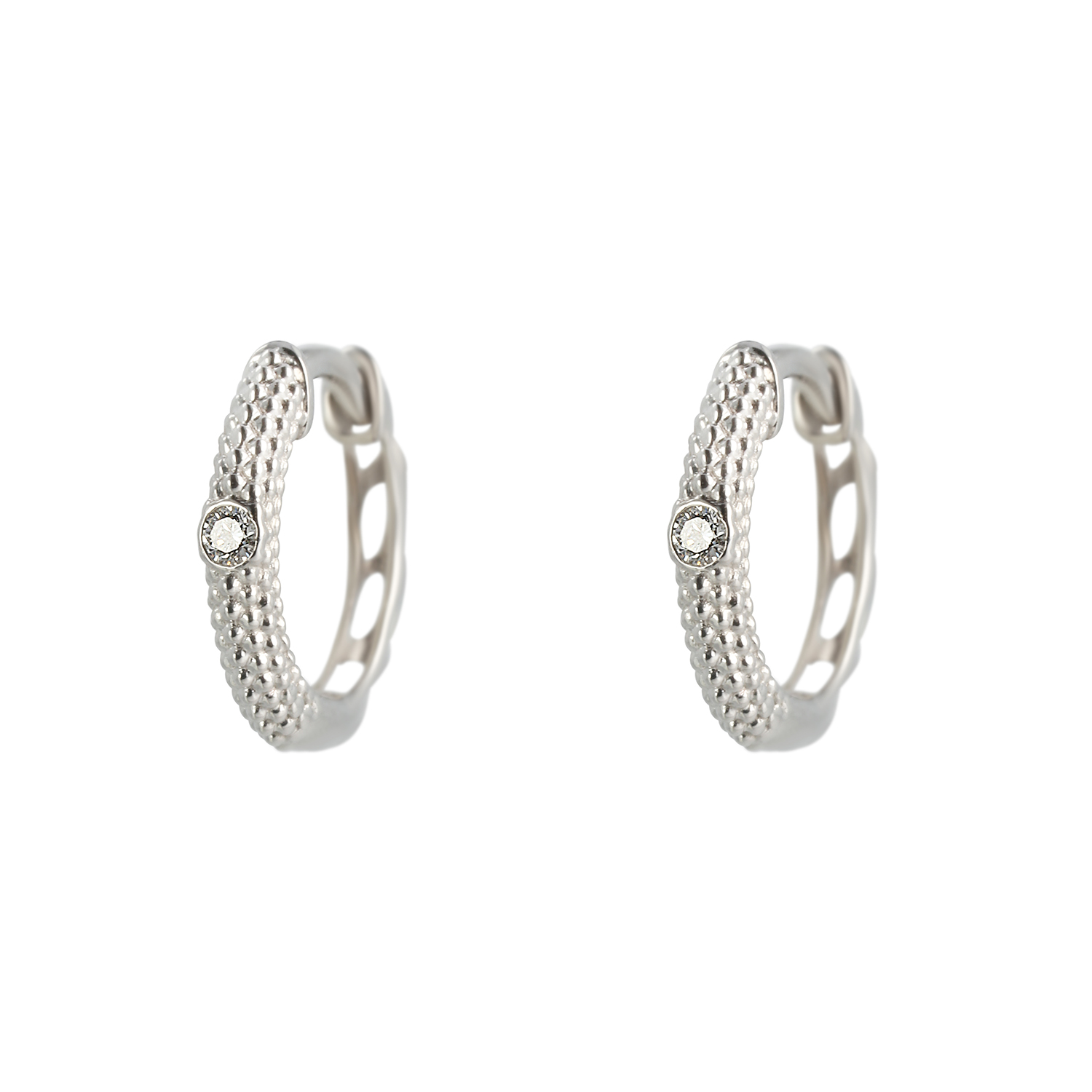 Элегантные серьги из белого золота с изысканной текстурированной поверхностью и лаконичным бриллиантовым акцентом. В украшении использовано 2 бриллианта общим весом 0,038 карата, качества H/SI, обеспечивающих красивый блеск и чистоту. Классическая форма и утончённая отделка делают эти серьги универсальным украшением для повседневной носки и особых случаев.