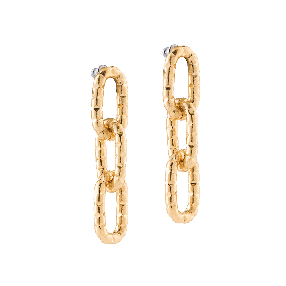 Стильные серьги Rebecca, состоящие из трёх соединённых золотистых звеньев с выразительной текстурой. Геометричный и минималистичный дизайн создаёт современный, женственный образ, идеально подходящий как для повседневного стиля, так и для вечерних нарядов. Фактурная поверхность звеньев красиво отражает свет, придавая украшению роскошное сияние.